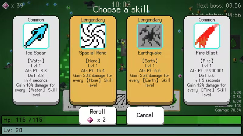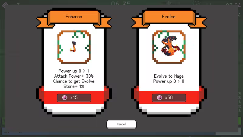 The skills you possess will attack automatically, so you don’t have to worry about missing your attack timing. When you level up, you will get a chance to acquire a new skill or upgrade an existing one. If you are not satisfied with the drawn skill, you can use an [Evolution Stone] to redraw.