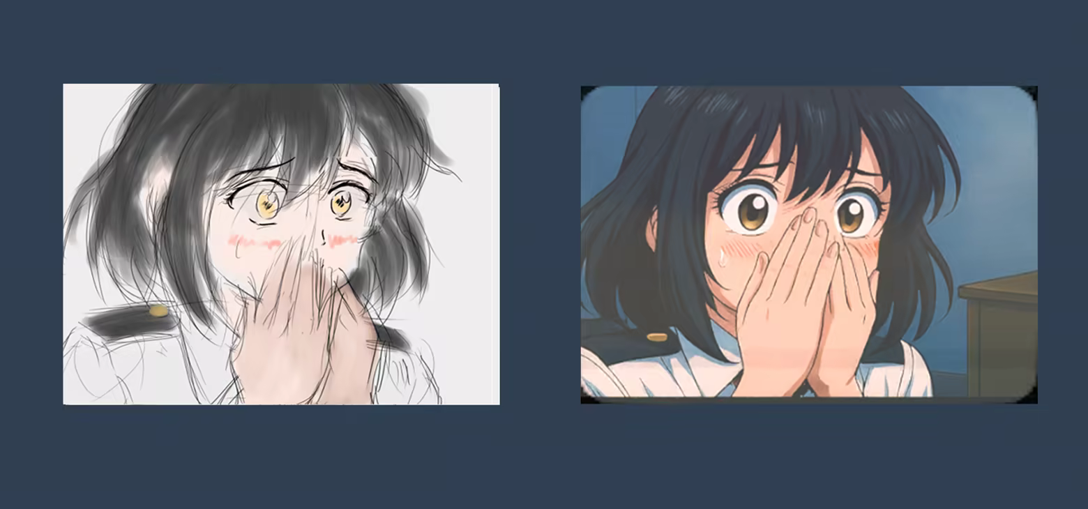 因成本限制,我們以自行繪製的色塊分鏡草圖為基礎,藉由 AI 技術實現風格化迭代與上色渲染,此技術僅用於 CG 部分,敬請各位諒解。