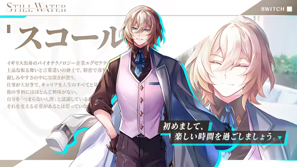 上品な振る舞いと言葉遣いの紳士で、お洒落で落ち着いた印象を与える外見。親しみやすさの中に冷淡さが漂う。
